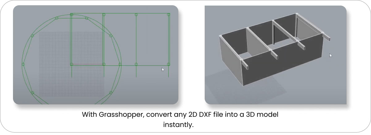 With the Building example, we can get a 2D DXF file, complete with its layers, objects, and curves, to a 3D object with thickness, completely inside Grasshopper. And since it is linked, any modification in the master DXF file will get instantly reflected in the 3D object. From 2D floor plan to 3D model, instantly!