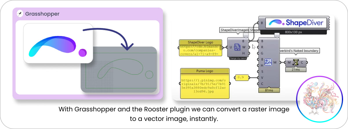 First, you can convert a raster image into a vector image, instantly. And a second, more interesting use case is the ability to integrate it into other scripts so that it can read and adapt to the new curve information. The example of the Voronoi pattern exemplifies this approach.