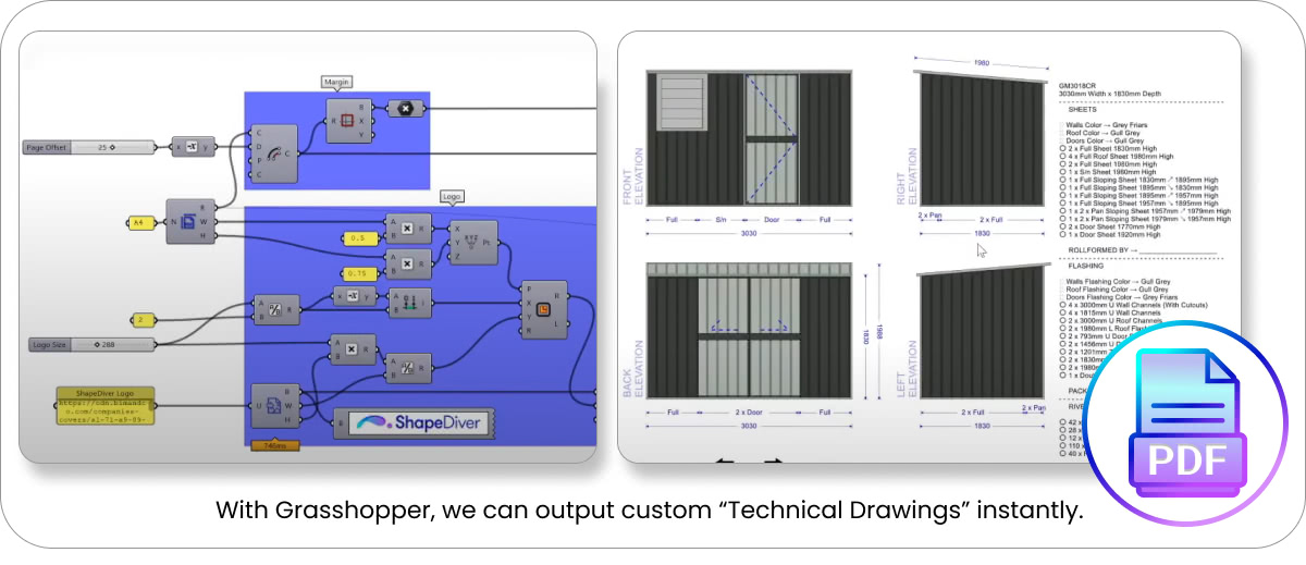In the Squid plugin (ShapeDiver Edition), we have added a new component called Squid PDF. Once you have built the script with various image objects, the true potential of a “parametric PDF” starts to shine.