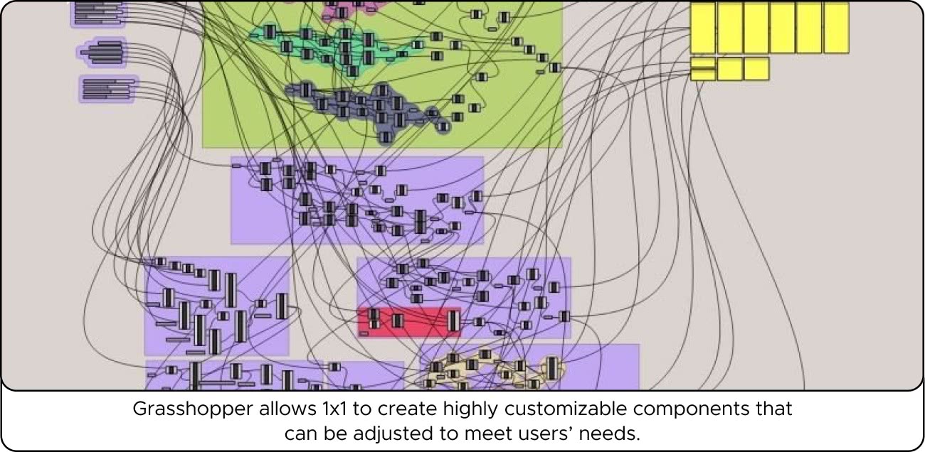 We chose Grasshopper for its powerful integration with Rhino, which we and other designers have used to create static products. It was natural to use a familiar tool that connects seamlessly. Grasshopper allows us to create highly customizable components that can be easily adjusted to meet user needs. Its algorithm-driven components ensure adaptable and precise designs, aligning with our modular and circular production principles.