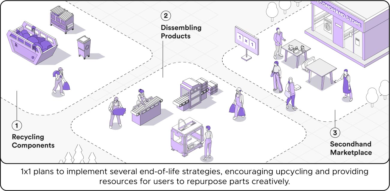 We plan to implement several end-of-life strategies, including take-back programs for recycling or repurposing components, detailed disassembly instructions, and a marketplace for second-hand parts. By facilitating these options, we aim to minimize waste and ensure that materials are continuously cycled back into use. Additionally, we encourage upcycling and provide resources for users to repurpose parts creatively.