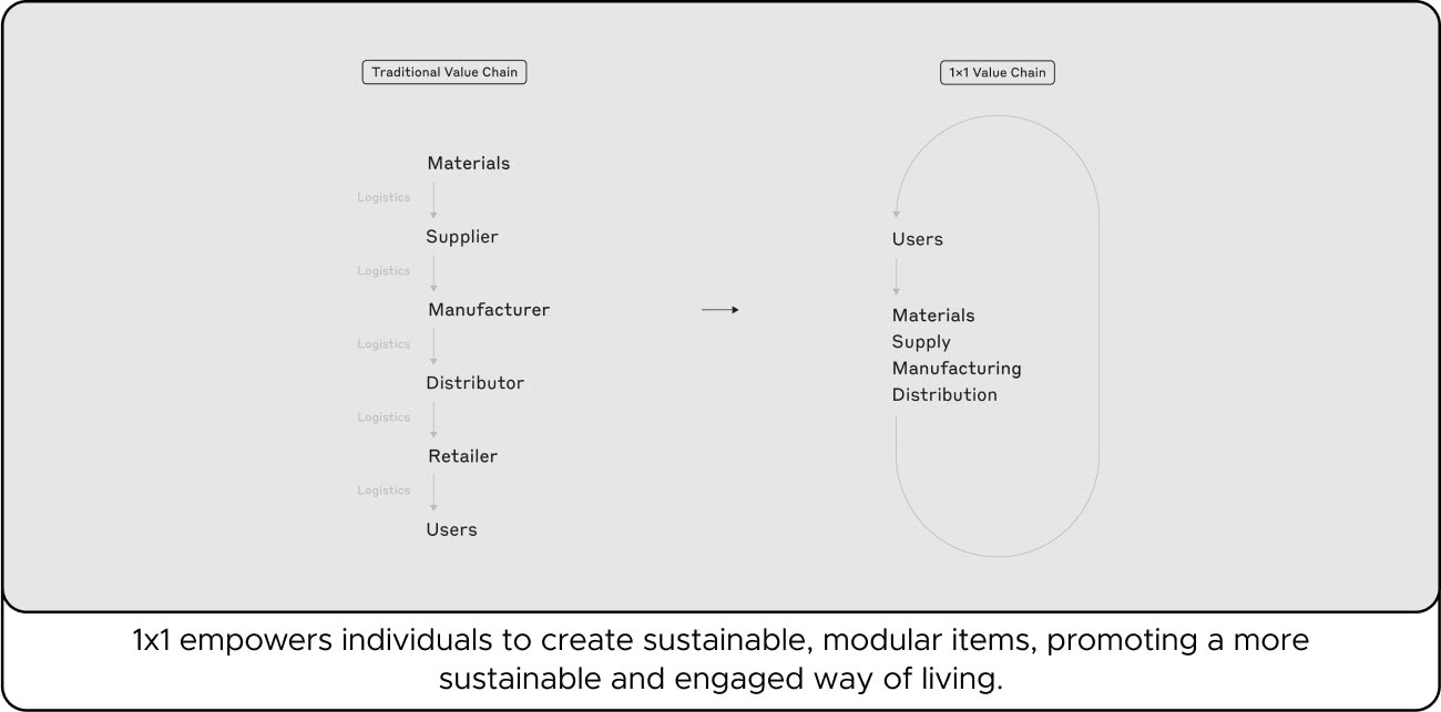 We also aim to reconnect consumers with the manufacturing process by offering high-quality, customizable products that can be locally produced. By overcoming the low design standards and technical complexities of existing 3D-printing solutions, 1x1 empowers individuals to create sustainable, modular items, promoting a more sustainable and engaged way of living.
