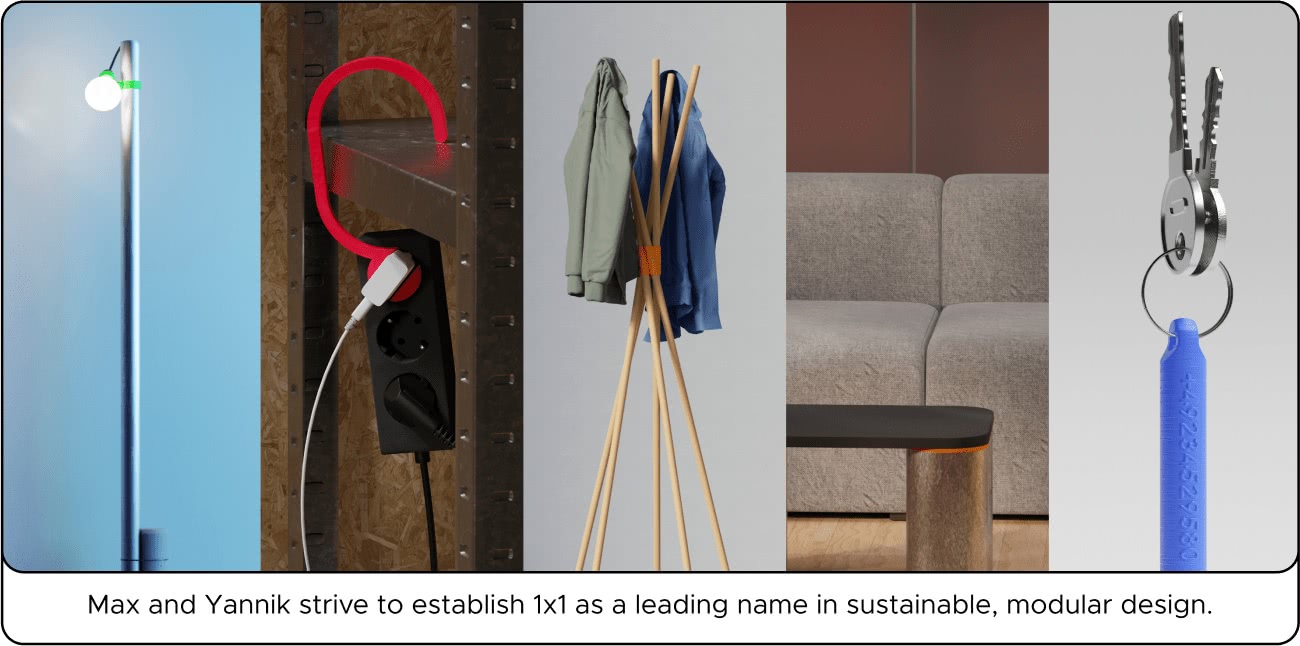 1x1 is a German-based design company founded by lifelong friends Max and Yannik. With Max's experience from top design studios and Yannik's expertise in 3D printing and algorithm programming, they created 1x1 to change how we create and use everyday products. Their mission focuses on making custom furniture, lighting, tools, and accessories using locally sourced and repurposed materials, promoting a circular production model with a low carbon footprint.