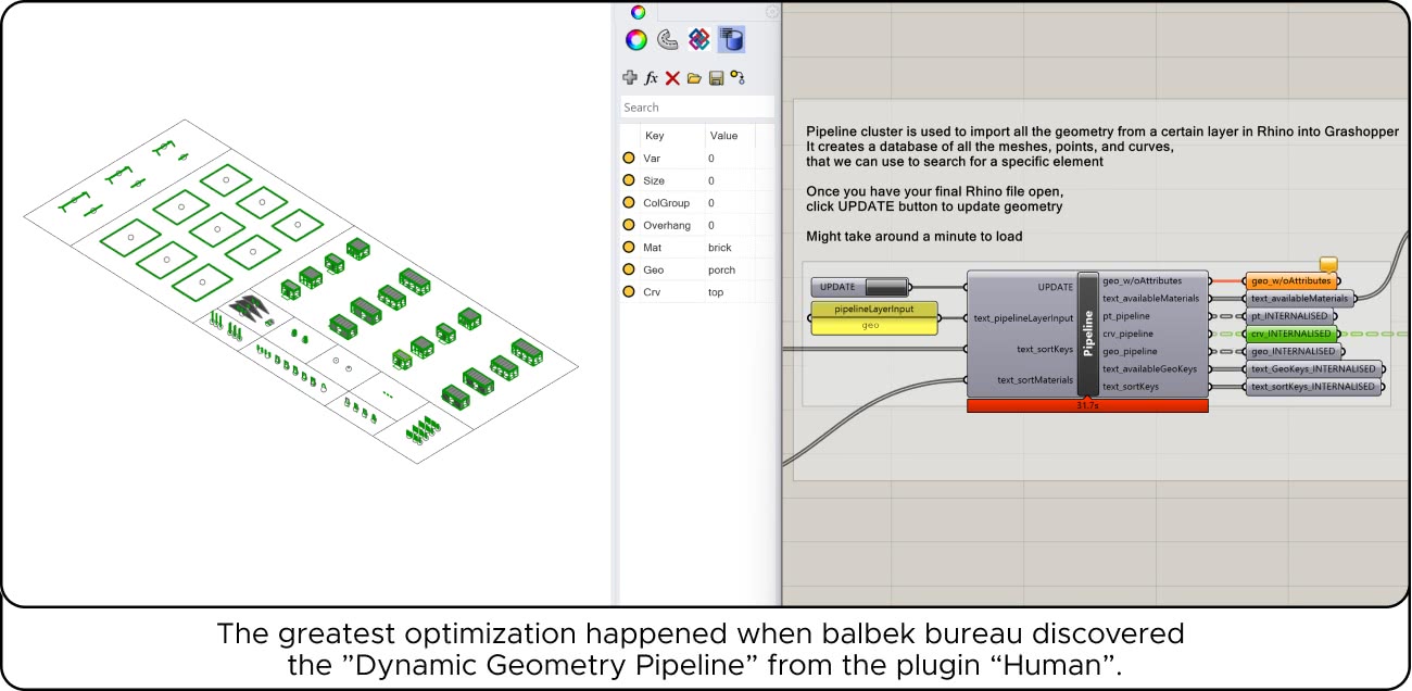 The greatest optimization happened when we discovered the ”Dynamic Geometry Pipeline” from the plugin “Human,” which imported all our volumes, curves, and points into Grasshopper in one click and let us store them in just one node, which in turn, significantly simplified the task of internalization. Now, any slightest change in the Rhino geometry could be instantaneously updated in Grasshopper. That feels really good! What doesn’t feel good is not being able to find a specific element in an enormous list of flattened data.