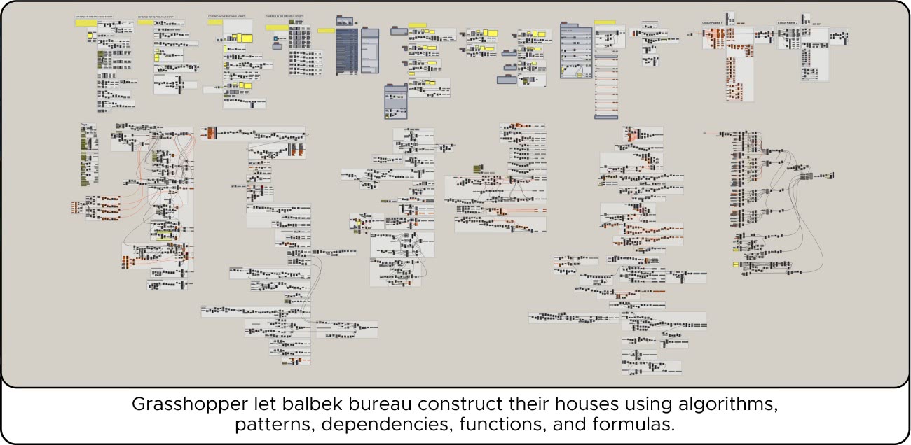 Parametric modeling lets us construct the house using algorithms, patterns, dependencies, functions, and formulas. This makes all the elements of the model interdependent and interchangeable, producing a vast field for variation with just a few clicks.
