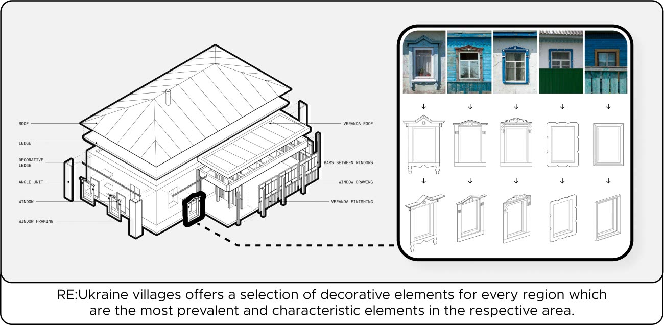 RE:Ukraine Villages tool is based on thorough research of each region's design code. Our team examines structural and decorative patterns and presents them in an accessible digital format for people to discover and consider when (re)building their homes.